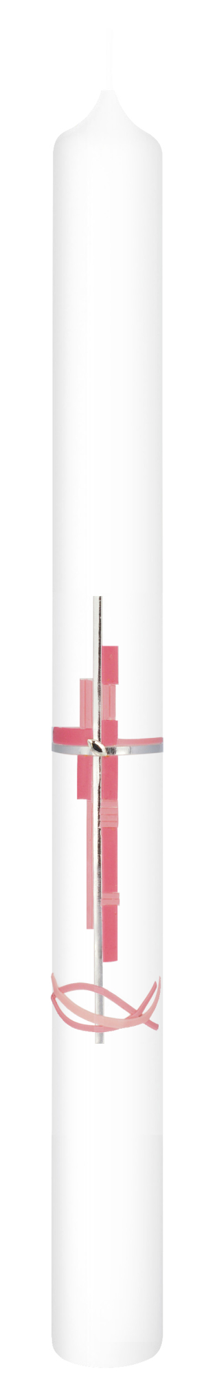 Kommunionkerze Motiv "Rosa-silbernes Wachskreuz mit Fisch" soll das Kommunionkind ein Leben lang begleiten.
