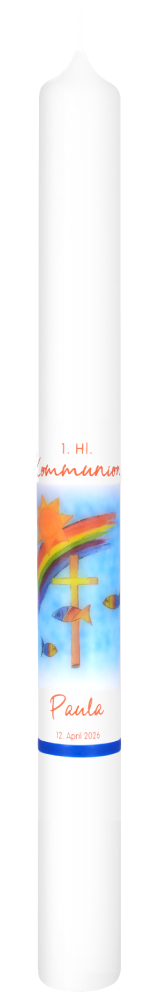 Kommunionkerze Motiv "Regenbogen, Fische und Kreuz" soll das Kommunionkind ein Leben lang begleiten.