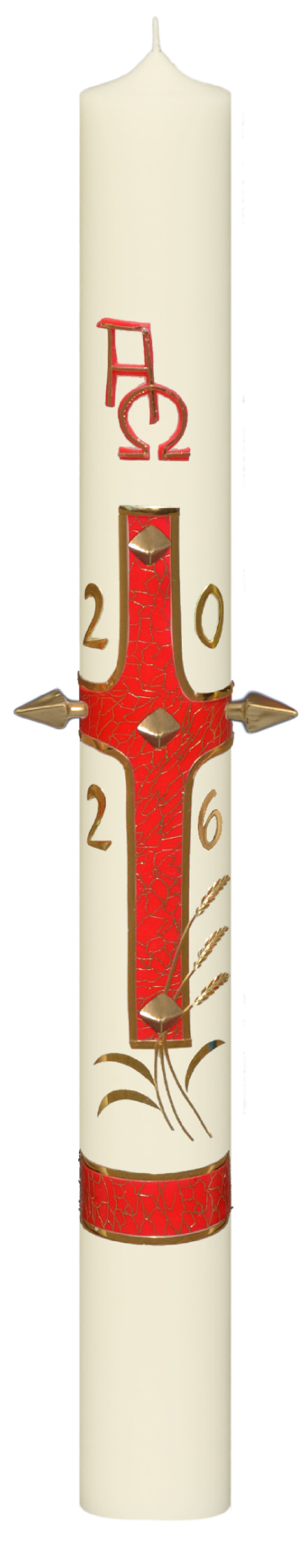 Das Motiv besticht durch ein leuchtend rotes, marmoriertes Wachskreuz, welches mit edlen Golddetails verfeinert wurde. Die goldene Ähre und das Abschlussband aus Wachs sowie die ΑΩ-Symbole vollenden das christliche Design.