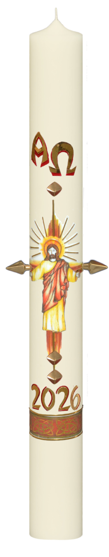 Unsere eigenen Künstler verarbeiten Liturgie, Glaubensbotschaften und aktuelle Themen zu künstlerisch anspruchsvollen Ornamenten auf dieser Osterkerze.